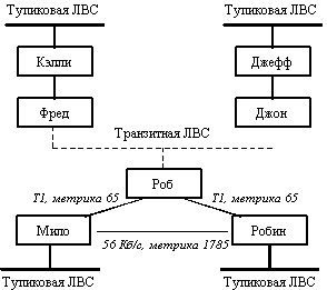 Посмотрим теперь, как Робин вычисляет маршрут через сеть. Две из связей, присоединенных к его портам, представляют линии T-1, а одна - линию 56 Кб/c. Робин сначала обнаруживает двух соседей - Роба с метрикой 65 и Мило с метрикой 1785. Из объявления о связях Роба Робин обнаружил наилучший путь к Мило со стоимостью 130, поэтому он отверг непосредственный путь к Мило, поскольку он связан с большей задержкой, так как проходит через линии с меньшей пропускной способностью. Робин также обнаруживает транзитную локальную сеть с выделенным маршрутизатором Джоном. Из объявлений о связях Джона Робин узнает о пути к Фреду и, наконец, узнает о пути к маршрутизаторам Келли и Джеффу и к их тупиковым сетям.