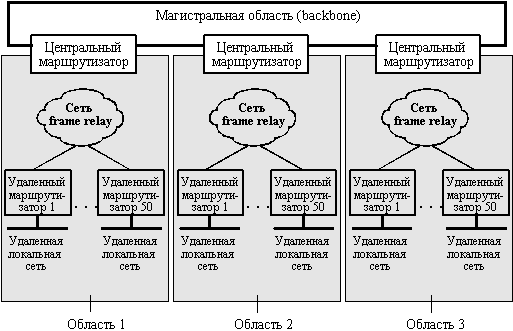 Для каждого из удаленных филиалов нет необходимости иметь детальную маршрутную информацию о всех других удаленных офисах, в особенности, если они взаимодействуют в основном с центральными компьютерами, связанными с центральными маршрутизаторами. Аналогично, центральным маршрутизаторам нет необходимости иметь детальную информацию о топологии связей с удаленными офисами, соединенными с другими центральными маршрутизаторами. В то же время центральные маршрутизаторы нуждаются в информации, необходимой для передачи пакетов следующему центральному маршрутизатору. Администратор мог бы без труда разделить эту сеть на более мелкие домены маршрутизации для того, чтобы ограничить объемы хранения и передачи по линиям связи не являющейся необходимой информации. Обобщение маршрутной информации является главной целью введения областей в OSPF.