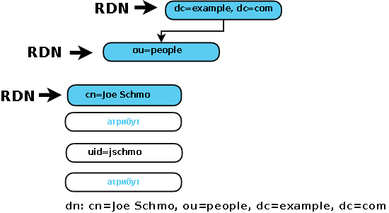 DN состоит из серии RDN (Relative Distinguished Names, относительных уникальных имён), определяемых путём перемещения ВВЕРХ по дереву (DIT) в направлении его корневой записи (суффикса или базовой записи), и записываемых СЛЕВА НАПРАВО, в отличие, например, от файловой системы, где пути записываются СПРАВА НАЛЕВО.