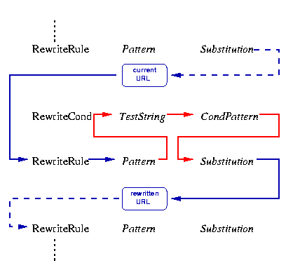 Как вы можете видеть, сначала URL проверяется на соответствие Pattern(шаблону) каждого из правил. При неудаче mod_rewrite сразу же останавливает обработку этого правила и продолжает используя следующее. Если Pattern(шаблон) совпадает, mod_rewrite ищет соответствующие этому правилу условия. Если их нет, он просто заменяет URL новой величиной полученной из строки Substitution(подстановка) и продолжает дальше обрабатывать правила. Однако если существуют условия, запускается внутренний цикл для их обработки в том порядке в котором они перечислены. Для условий эта логика другая: мы не сравниваем URL на соответствие какому-либо шаблону. Вместо этого мы сначала создаем строку TestString дополняя её переменными, обратными ссылками, запросами к карте, и т.д. и затем пытаемся проверять на соответствие с CondPattern. Если шаблон не соответствует, весь набор условий и соответствующих правил считается несоответствующим условию. Если есть соответствие шаблону, в этом случае производится обработка следующего условия до тех пор пока они будут не исчерпаны. Если все условия совпадают, процесс обработки продолжается с использованием для URL подстановки из Substitution (подстановка).