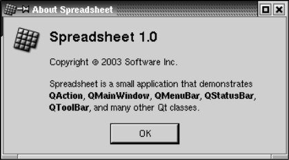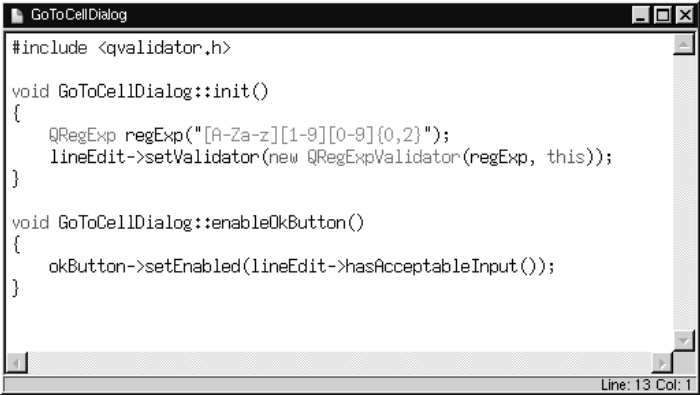 Если во время компиляции возникла ошибка в строке 8, то это означает, что у вас установлена более старая версия Qt, чем требуется. Напоминаем еще раз, что для прогона примеров из этой книги вы должны установить Qt 3.2 или более поздний выпуск Qt 3. |