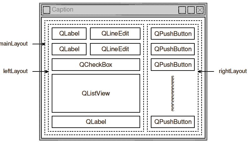 Размещением компонентов на форме управляют один QHBoxLayout, один QGridLayout и один QVBoxLayout. QGridLayout и
