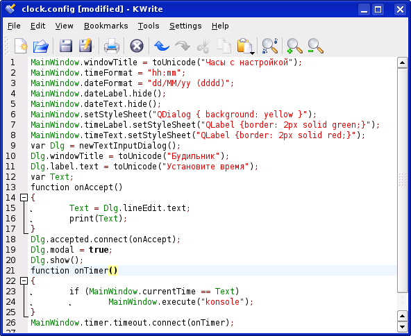 JavaScript основан на ECMAScript, так что конфигурационные файлы Clock можно править в KWrite со всеми удобствами.