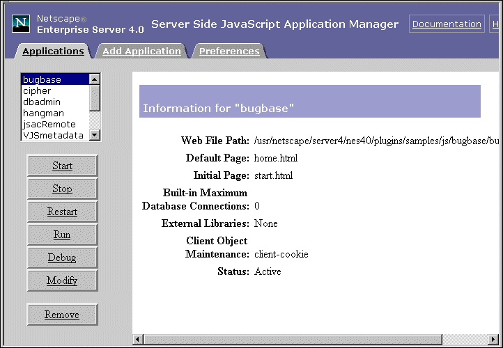 Application Manager отображает в прокручиваемом левом фрэйме (кадре/окне) все приложения JavaScript, установленные в данный момент на сервере. Выберите нужное приложение, щёлкнув на его имени в прокручиваемом списке.