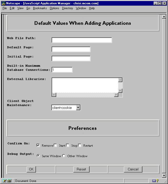 Чтобы конфигурировать установки по умолчанию для Application Manager, щёлкните Configure (в Enteprise Server 3.x) или Preferences (в Enterprise Server 4.0) в верхнем фрэйме Application Manager'а. В ответ Application Manager отобразит форму, показанную на Рисунке 3.6.