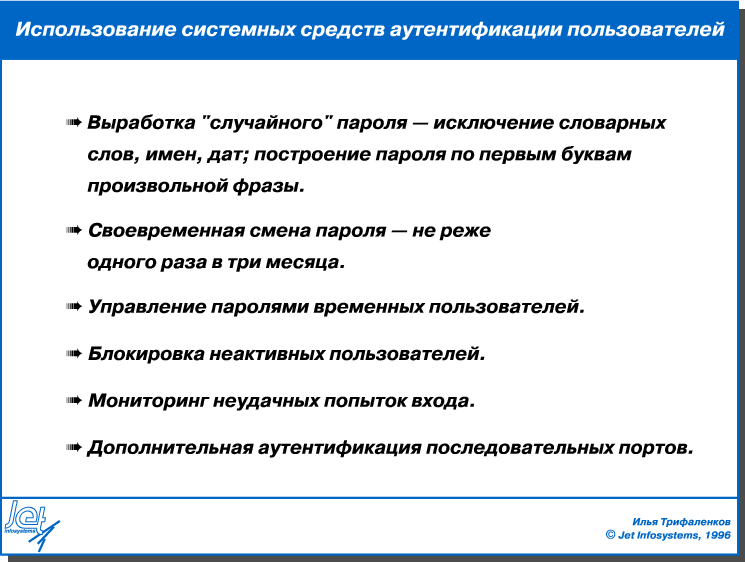 При описанном подходе очень существенной оказывается политика управления пользовательскими паролями, определяющая правила их назначения, хранения, изменения и другие связанные с этим вопросы. Чем большие возможности по проведению подобной политики предоставляет администратору операционная система, тем больше шансов на то, что парольная аутентификация будет действенным инструментом защиты. Для иллюстрации важности разумной политики назначения пользовательских имен и паролей можно привести данные исследований, проведенных в AT&T, показывающие, что из 500 попыток несанкционированного доступа около 300 составляют попытки угадывания паролей или беспарольного входа по пользовательским именам guest, demo и т.д.