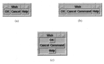 Опция -side. На примере (см. Рисунок 2 а) показан, результат выполнение команды pack .ok .cancel .help. -side left. Если во время выполнения программы растянуть окно, то оно будет выглядеть как на Рисунке 2b.