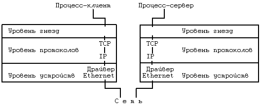 Структура ядра имеет три уровня: гнезд, протоколов и устройств (Рисунок 11.18). Уровень гнезд выполняет функции интерфейса между обращениями к операционной системе (системным функциям) и средствами низких уровней, уровень протоколов содержит модули, обеспечивающие взаимодействие процессов (на рисунке упомянуты протоколы TCP и IP), а уровень устройств содержит драйверы, управляющие сетевыми устройствами. Допустимые сочетания протоколов и драйверов указываются при построении системы (в секции конфигурации); этот способ уступает по гибкости вышеупомянутому потоковому механизму. Процессы взаимодействуют между собой по схеме клиент-сервер: сервер ждет сигнала от гнезда, находясь на одном конце дуплексной линии связи, а процессы-клиенты взаимодействуют с сервером через гнездо, находящееся на другом конце, который может располагаться на другой машине. Ядро обеспечивает внутреннюю связь и передает данные от клиента к серверу.