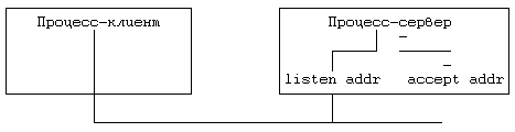 где sd - дескриптор гнезда, address - адрес структуры, определяющей идентификатор, характерный для данной комбинации домена и протокола (в функции socket). Length - длина структуры address; без этого параметра ядро не знало бы, какова длина структуры, поскольку для разных доменов и протоколов она может быть различной. Например, для домена "UNIX system" структура содержит имя файла. Процессы-серверы связывают гнезда с именами и объявляют о состоявшемся присвоении имен процессам-клиентам.