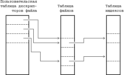 Ядро поддерживает еще две информационные структуры, таблицу файлов и пользовательскую таблицу дескрипторов файла. Таблица файлов выступает глобальной структурой ядра, а пользовательская таблица дескрипторов файла выделяется под процесс. Если процесс открывает или создает файл, ядро выделяет в каждой таблице элемент, корреспондирующий с индексом файла. Элементы в этих трех структурах - в пользовательской таблице дескрипторов файла, в таблице файлов и в таблице индексов - хранят информацию о состоянии файла и о доступе пользователей к нему. В таблице файлов хранится смещение в байтах от начала файла до того места, откуда начнет выполняться следующая команда пользователя read или write, а также информация о правах доступа к открываемому процессу. Таблица дескрипторов файла идентифицирует все открытые для процесса файлы. На Рисунке 2.2 показаны эти таблицы и связи между ними. В системных операциях open (открыть) и creat (создать) ядро возвращает дескриптор файла, которому соответствует указатель в таблице дескрипторов файла. При выполнении операций read (читать) и write (писать) ядро использует дескриптор файла для входа в таблицу дескрипторов и, следуя указателям на таблицу файлов и на таблицу индексов, находит информацию в файле. Более подробно эти информационные структуры рассматриваются в главах 4 и 5. Сейчас достаточно сказать, что использование этих таблиц обеспечивает различную степень разделения доступа к файлу.
