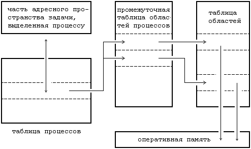 Каждому процессу соответствует точка входа в таблице процессов ядра, кроме того, каждому процессу выделяется часть оперативной памяти, отведенная под задачу пользователя. Таблица процессов включает в себя указатели на промежуточную таблицу областей процессов, точки входа в которую служат в качестве указателей на собственно таблицу областей. Областью называется непрерывная зона адресного пространства, выделяемая процессу для размещения текста, данных и стека. Точки входа в таблицу областей описывают атрибуты области, как например, хранятся ли в области текст программы или данные, закрытая ли эта область или же совместно используемая, и где конкретно в памяти размещается содержимое области. Внешний уровень косвенной адресации (через промежуточную таблицу областей, используемых процессами, к собственно таблице областей) позволяет независимым процессам совместно использовать области. Когда процесс запускает системную операцию exec, ядро системы выделяет области под ее текст, данные и стек, освобождая старые области, которые использовались процессом. Если процесс запускает операцию fork, ядро удваивает размер адресного пространства старого процесса, позволяя процессам совместно использовать области, когда это возможно, и, с другой стороны, производя физическое копирование. Если процесс запускает операцию exit, ядро освобождает области, которые использовались процессом. На Рисунке 2.5 изображены информационные структуры, связанные с запуском процесса. Таблица процессов ссылается на промежуточную таблицу областей, используемых процессом, в которой содержатся указатели на записи в собственно таблице областей, соответствующие областям для текста, данных и стека процесса.