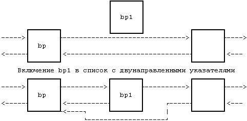 В качестве примера рассмотрим программу (Рисунок 2.7) включения информационной структуры, чей адрес содержится в указателе bp1, в список с использованием указателей после структуры, чей адрес содержится в bp. Если система разрешила переключение контекста при выполнении ядром фрагмента программы, возможно возникновение следующей ситуации. Предположим, ядро выполняет программу до комментариев и затем осуществляет переключение контекста. Список с использованием сдвоенных указателей имеет противоречивый вид: структура bp1 только наполовину входит в этот список. Если процесс следует за передними указателями, он обнаружит bp1 в данном списке, но если он последует за фоновыми указателями, то вообще не найдет структуру bp1 (Рисунок 2.8). Если другие процессы будут обрабатывать указатели в списке до момента повторного запуска первого процесса, структура списка может постоянно разрушаться. Система UNIX предупреждает возникновение подобных ситуаций, запрещая переключение контекстов на время выполнения процесса в режиме ядра. Если процесс переходит в состояние "сна", делая допустимым переключение контекста, алгоритмы ядра обеспечивают защиту целостности информационных структур системы.