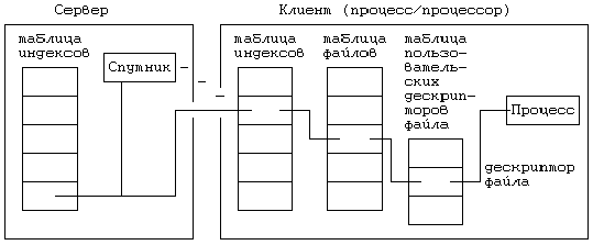 В случае с системной функцией open запрос на исполнение функции, посылаемый на удаленную машину, включает в себя часть имени файла, оставшуюся после исключения компонент имени пути поиска, отличающих удаленный файл, а также различные флаги. В рассмотренном ранее примере с открытием файла "/usr/src/cmd/login.c" ядро посылает на удаленную машину имя "cmd/login.c". Сообщение также включает в себя опознавательные данные, такие как пользовательский и групповой коды идентификации, необходимые для проверки прав доступа к файлам на удаленной машине. Если с удаленной машины поступает ответ, свидетельствующий об успешном выполнении функции open, локальное ядро выбирает свободный индекс в памяти локальной машины и помечает его как индекс удаленного файла, сохраняет информацию об удаленной машине и удаленном индексе и по заведенному порядку выделяет новую запись в таблице файлов. В сравнении с реальным индексом на удаленной машине индекс, принадлежащий локальной машине, является формальным, не нарушающим конфигурацию модели, которая в целом совпадает с конфигурацией, используемой при вызове удаленной процедуры (Рисунок 13.11). Если вызываемая процессом функция обращается к удаленному файлу по его дескриптору, локальное ядро узнает из индекса (локального) о том, что файл удаленный, формулирует запрос, включающий в себя вызываемую функцию, и посылает его на удаленную машину. В запросе содержится указатель на удаленный индекс, по которому процесс-спутник сможет идентифицировать сам удаленный файл.