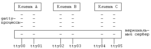 *15. Когда пользователь регистрируется в системе, дисциплина терминальной линии сохраняет информацию о том, что терминал является операторским, ведущим группу процессов. По этой причине, когда пользователь на клавиатуре терминала нажимает клавишу "break", сигнал прерывания получают все процессы группы. Рассмотрим конфигурацию системы, в которой все терминалы физически подключаются к одной машине, но регистрация пользователей логически реализуется на других машинах (Рисунок 13.13). В каждом отдельном случае система создает для удаленного терминала getty-процесс. Если запросы к удаленной системе обрабатываются с помощью набора процессов-серверов, следует отметить, что при выполнении процедуры открытия сервер останавливается в ожидании подключения. Когда выполнение функции open завершается, сервер возвращается обратно в серверный пул, разрывая свою связь с терминалом. Каким образом осуществляется рассылка сигнала о прерывании, вызываемого нажатием клавиши "break", по адресам процессов, входящих в одну группу?