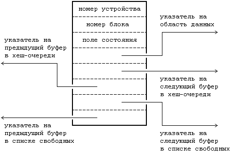 Во время инициализации системы ядро выделяет место под совокупность буферов, потребность в которых определяется в зависимости от размера памяти и производительности системы. Каждый буфер состоит из двух частей: области памяти, в которой хранится информация, считываемая с диска, и заголовка буфера, который идентифицирует буфер. Поскольку существует однозначное соответствие между заголовками буферов и массивами данных, в нижеследующем тексте используется термин "буфер" в ссылках как на ту, так и на другую его составляющую, и о какой из частей буфера идет речь будет понятно из контекста.