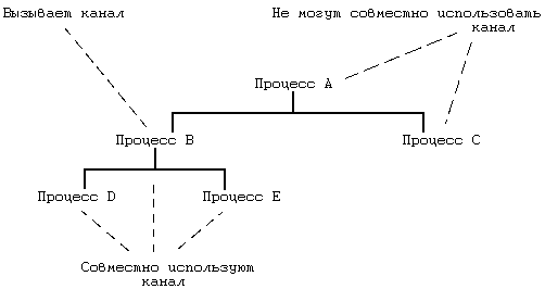 Каналы позволяют передавать данные между процессами в порядке поступления ("первым пришел - первым вышел"), а также синхронизировать выполнение процессов. Их использование дает процессам возможность взаимодействовать между собой, пусть даже не известно, какие процессы находятся на другом конце канала. Традиционная реализация каналов использует файловую систему для хранения данных. Различают два вида каналов: поименованные каналы и, за отсутствием лучшего термина, непоименованные каналы, которые идентичны между собой во всем, кроме способа первоначального обращения к ним процессов. Для поименованных каналов процессы используют системную функцию open, а системную функцию pipe - для создания непоименованного канала. Впоследствии, при работе с каналами процессы пользуются обычными системными функциями для файлов, такими как read, write и close. Только связанные между собой процессы, являющиеся потомками того процесса, который вызвал функцию pipe, могут разделять доступ к непоименованным каналам. Например (см. Рисунок 5.15), если процесс B создает канал и порождает процессы D и E, эти три процесса разделяют между собой доступ к каналу, в отличие от процессов A и C. Однако, все процессы могут обращаться к поименованному каналу независимо от взаимоотношений между ними, при условии наличия обычных прав доступа к файлу. Поскольку непоименованные каналы встречаются чаще, они будут рассмотрены первыми.