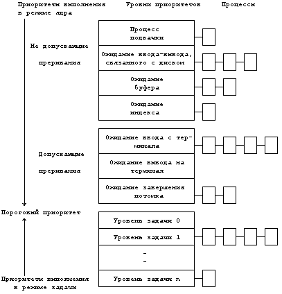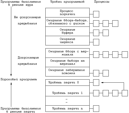Пороговое значение между приоритетами выполнения в режимах ядра и задачи на Рисунке 8.2 отмечено двойной линией, проходящей между приоритетом ожидания завершения потомка (в режиме ядра) и нулевым приоритетом выполнения в режиме задачи. Приоритеты процесса подкачки, ожидания ввода-вывода, связанного с диском, ожидания буфера и индекса являются высокими, не допускающими прерывания системными приоритетами, с каждым из которых связана очередь из 1, 3, 2 и 1 процесса, соответственно, в то время как приоритеты ожидания ввода с терминала, вывода на терминал и завершения потомка являются низкими, допускающими прерывания системными приоритетами, с каждым из которых связана очередь из 4, 0 и 2 процессов, соответственно. На рисунке представлены также уровни приоритетов выполнения в режиме задачи (*).