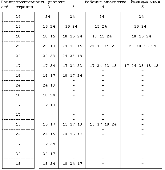 На Рисунке 9.12 приведена последовательность используемых процессом указателей страниц, описывающих рабочие множества с окнами различных размеров при условии соблюдения алгоритма замещения "стариков" (замещения страниц путем откачки тех, к которым наиболее долго не было обращений). По мере выполнения процесса его рабочее множество видоизменяется в соответствии с используемыми процессом указателями страниц; увеличение размера окна влечет за собой увеличение рабочего множества и, с другой стороны, сокращение числа ошибок в выполнении процесса. Использование неизменного рабочего множества не практикуется, поскольку запоминание очередности следования указателей страниц потребовало бы слишком больших затрат. Приблизительное соответствие между изменяемым рабочим множеством и пространством процесса достигается путем установки бита упоминания (reference bit) при обращении к странице памяти, а также периодическим опросом указателей страниц. Если на страницу была сделана ссылка, эта страница включается в рабочее множество; в противном случае она "дозревает" в памяти в ожидании своей очереди.