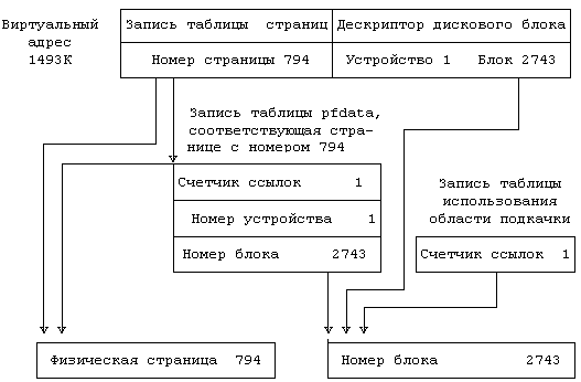 На Рисунке 9.14 показана взаимосвязь между записями таблицы страниц, дескрипторами дисковых блоков, записями таблицы pfdata и таблицы использования области подкачки. Виртуальный адрес 1493К отображается на запись таблицы страниц, соответствующую странице с физическим номером 794; дескриптор дискового блока, связанный с этой записью, свидетельствует о том, что содержимое страницы располагается на устройстве выгрузки с номером 1 в дисковом блоке с номером 2743. Запись таблицы pfdata, помимо того, что указывает на те же номера устройства и блока, сообщает, что счетчик ссылок на физическую страницу имеет значение, равное 1. Счетчик ссылок на виртуальную страницу (в записи таблицы использования области подкачки) свидетельствует о том, что на копию страницы на устройстве выгрузки ссылается только одна запись таблицы страниц.