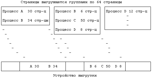 Предположим, к примеру, что "сборщик" страниц выгружает 30, 40, 50 и 20 страниц из процессов A, B, C и D, соответственно, и что за одну операцию выгрузки на дисковое устройство откачиваются 64 страницы. На Рисунке 9.20 показана последовательность имеющих при этом место операций выгрузки при условии, что "сборщик" страниц осуществляет просмотр страниц процессов в очередности: A, B, C, D. "Сборщик" выделяет на устройстве выгрузки место для 64 страниц и выгружает 30 страниц процесса A и 34 страницы процесса B. Затем он выделяет место для следующих 64 страниц и выгружает оставшиеся 6 страниц процесса B, 50 страниц процесса C и 8 страниц процесса D. Выделенные для размещения страниц за две операции участки области выгрузки могут быть и несмежными. "Сборщик" сохраняет оставшиеся 12 страниц процесса D в списке выгружаемых страниц, но не выгружает их до тех пор, пока список не будет заполнен до конца. Как только у процессов возникает потребность в подкачке страниц с устройства выгрузки или если страницы больше не нужны использующим их процессам (процессы завершились), в области выгрузки освобождается место.