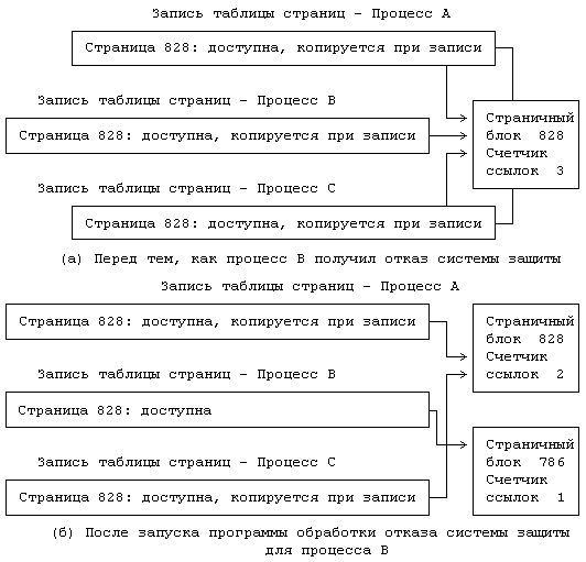 Теперь на страницу могут ссылаться обе области, использующие эту страницу совместно, пока процесс не ведет на нее запись. Как только страница понадобится процессу для записи, ядро создаст ее копию, с тем, чтобы у каждой области была своя личная версия страницы. Для этого при выполнении функции fork в каждой записи таблицы страниц, соответствующей частным областям родителя и потомка, ядро устанавливает бит "копирования при записи". Если один из процессов попытается что-то записать на страницу, он получит отказ системы защиты, после чего для него будет создана новая копия содержимого страницы. Таким образом, физическое копирование страницы откладывается до того момента, когда в этом возникнет реальная потребность.