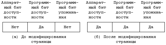 Наибольшая действенность алгоритмов замещения страниц по запросу (обращению) достигается в том случае, если биты упоминания и модификации устанавливаются аппаратным путем и тем же путем вызывается отказ системы защиты при попытке записи в страницу, имеющую признак "копирования при записи". Тем не менее, указанные алгоритмы вполне применимы даже тогда, когда аппаратура распознает только бит доступности и код защиты. Если бит доступности, устанавливаемый аппаратно, дублируется программно-устанавливаемым битом, показывающим, действительно ли страница доступна или нет, ядро могло бы отключить аппаратно-устанавливаемый бит и проимитировать установку остальных битов программным путем. Так, например, в машине VAX-11 бит упоминания отсутствует (см. [Levy 82]). Ядро может отключить аппаратно-устанавливаемый бит доступности для страницы и дальше работать по следующему плану. Если процесс ссылается на страницу, он получает отказ, поскольку бит доступности сброшен, и в игру вступает программа обработки отказа, исследующая страницу. Поскольку "программный" бит доступности установлен, ядро знает, что страница действительно доступна и находится в памяти; оно устанавливает "программный" бит упоминания и "аппаратный" бит доступности, но ему еще предстоит узнать о том, что на страницу была сделана ссылка. Последующие ссылки на страницу уже не встретят отказ, ибо "аппаратный" бит доступности установлен. Когда с ней будет работать "сборщик" страниц, он вновь сбросит "аппаратный" бит доступности, вызывая тем самым от казы на все последующие обращения к странице и возвращая систему к началу цикла. Этот случай показан на Рисунке 9.28.