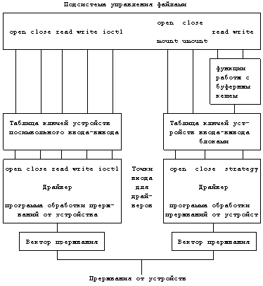 В системе UNIX имеется два типа устройств - устройства ввода/вывода блоками и устройства неструктурированного или посимвольного ввода-вывода. Как уже говорилось в главе 2, устройства ввода-вывода блоками, такие как диски и ленты, для остальной части системы выглядят как запоминающие устройства с произвольной выборкой; к устройствам посимвольного ввода-вывода относятся все другие устройства, в том числе терминалы и сетевое оборудование. Устройства ввода-вывода блоками могут иметь интерфейс и с устройствами посимвольного ввода-вывода.