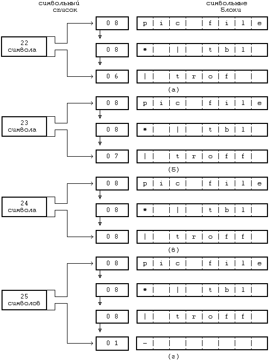 Символьные списки позволяют создать несложный механизм буферизации, полезный при небольшом объеме передаваемых данных, типичном для медленных устройств, таких как терминалы. Они дают возможность манипулировать с данными с каждым символом в отдельности и с группой символьных блоков. Например, Рисунок 10.11 иллюстрирует удаление символов из символьного списка; ядро удаляет по одному символу из первого блока в списке (Рисунок 10.11а-в) до тех пор, пока в блоке не останется ни одного символа (Рисунок 10.11г); затем оно устанавливает указатель списка на следующий блок, который становится первым блоком в списке. Подобно этому на Рисунке 10.12 показано, как ядро включает символы в символьный список; при этом предполагается, что в одном блоке помещается до 8 символов и что ядро размещает новый блок в конце списка (Рисунок 10.12г).