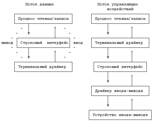 Терминальные драйверы выполняют ту же функцию, что и остальные драйверы: управление передачей данных от и на терминалы. Однако, терминалы имеют одну особенность, связанную с тем, что они обеспечивают интерфейс пользователя с системой. Обеспечивая интерактивное использование системы UNIX, терминальные драйверы имеют свой внутренний интерфейс с модулями, интерпретирующими ввод и вывод строк. В каноническом режиме интерпретаторы строк преобразуют неструктурированные последовательности данных, введенные с клавиатуры, в каноническую форму (то есть в форму, соответствующую тому, что пользователь имел ввиду на самом деле) прежде, чем послать эти данные принимающему процессу; строковый интерфейс также преобразует неструктурированные последовательности выходных данных, созданных процессом, в формат, необходимый пользователю. В режиме без обработки строковый интерфейс передает данные между процессами и терминалом без каких-либо преобразований.