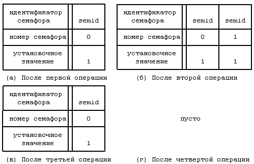 Ядро создает структуру восстановления всякий раз, когда процесс уменьшает значение семафора, а удаляет ее, когда процесс увеличивает значение семафора, поскольку установочное значение структуры равно 0. На Рисунке 11.17 показана последовательность состояний списка структур при выполнении программы с параметром 'a'. После первой операции процесс имеет одну структуру, состоящую из идентификатора semid, номера семафора, равного 0, и установочного значения, равного 1, а после второй операции появляется вторая структура с номером семафора, равным 1, и установочным значением, равным 1. Если процесс неожиданно завершается, ядро проходит по всем структурам и прибавляет к каждому семафору по единице, восстанавливая их значения в 0. В частном случае ядро уменьшает установочное значение для семафора 1 на третьей операции, в соответствии с увеличением значения самого семафора, и удаляет всю структуру целиком, поскольку установочное значение становится нулевым. После четвертой операции у процесса больше нет структур восстановления, поскольку все установочные значения стали нулевыми.