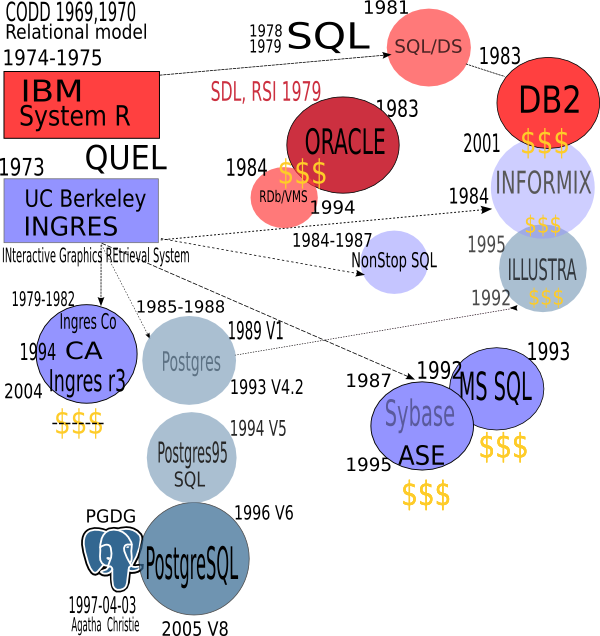 Я попытался графически ( большая версия картинки откроется в новом окне) отобразить все наиболее заметные RDBMS и связи между ними и приблизительно привел даты их создания и конца. Пересечение объектов означает поглощение, при этом поглощаемый объект более бледен и не окантован. Знак доллара означает, что база данных является коммерческой. При этом, я основывался на информации, доступной в интернете, в частности в Wikipedia, в научных статьях, которые я читал и комментариях непосредственных пользователей БД, которые я получил после публикации этой картинки в интернете.