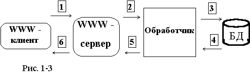 В этом варианте доступ к БД осуществляется специальной CGI-программой, запускаемой WWW-сервером в ответ на запрос WWW - клиента. Эта программа, обрабатывая запрос, просматривает содержимое БД и создает выходной HTML-документ, возвращаемый клиенту (см.рис.1-3).