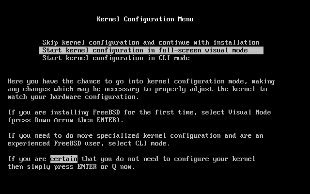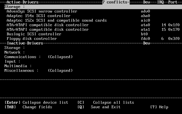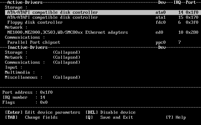 Because of this, the first thing you have the opportunity to do when installing FreeBSD is look at the list of drivers that are configured into the kernel, and either disable some of them, if you do not own that device, or confirm (and alter) the driver's configuration if you do own the device but the defaults are wrong.