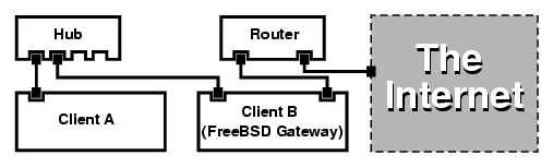 To do this, the FreeBSD machine on the Internet must act as a gateway. This gateway machine must have two NICs--one for connecting to the Internet router, the other connecting to a LAN. All the machines on the LAN are connected through a hub or switch.