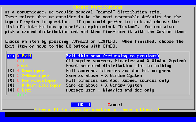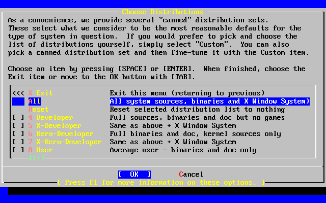 Press F1 for more information on the distribution set options and what they contain. When finished reviewing the help, pressing Enter will return to the Select Distributions Menu.