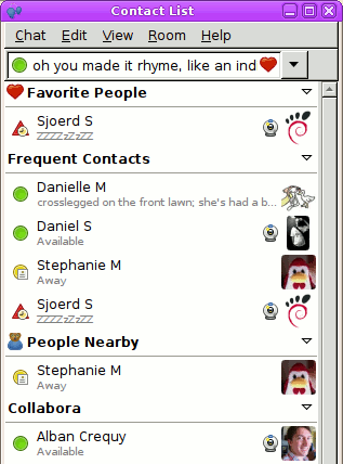 Примитивный внешний вид - в десктопном гноме оно выглядит жутко уныло. Скрин вырвиглазен, но честно говоря оно и с другими темами гнома не сильно лучше. Контактлист - почти не настраивается под себя, особенно в плане поддержки оным тем. Так что придется пялиться на вот такое вот уродство и хрен особо это пролечишь. Протоколы как правило реализованы абсолютно минимально (аватары хоть для некоторых есть - и на том, как говорится, спасибо). В итоге единственным плюсом этого кастратца является собссно войсчат. Ну, на нокиях еще интегренность с системой. Даже банальный пиджин более юзабелен как именно IM клиент. А на десктопе мне нравится qutim. Как минимум ася и жаббер там сделаны достаточно адекватно. Да и ирц какой-никакой есть. И уж по крайней мере контактлист и окно чата можно настроить до симпатичного юзеру вида, а не того уродства которое в этом. Юзать ЭТО можно только если ничем слаще уродцев типа MSовских месенжеров никогда не пользовался.
