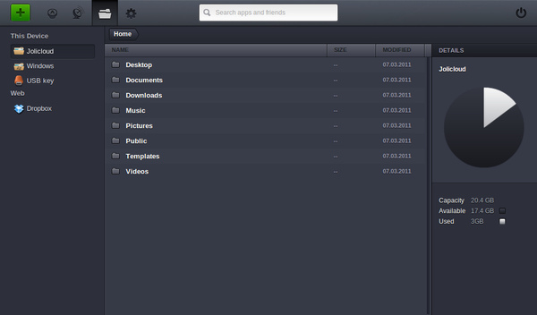 - Новый файловый менеджер. В Joli OS 1.2 обеспечена возможность доступа к локальным файлам прямо из web-окружения Jolicloud;