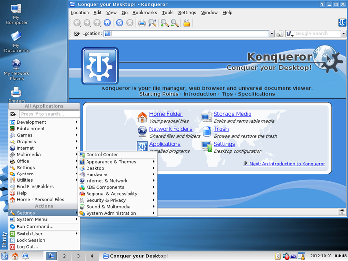 В итоге отказался от достаточно лёгкой, по нынешним меркам tde в пользу openbox + krusader (не могу я без 2х-панельного с простым в использовании доступом sftp/fish/smb) + konsole из kde4 (+ инвариантный набор прикладных рабочих инструментов). Жаль было kate, изнасилованную до неполноценности при переписывании на QT4, ужасно жаль kmail даи весь PIM, который теперь для запуска требует мускуль и пару сервисов поверх него... Жаль, что любая свистоперделка в трее современной ДЕ смело жрёт 25МБ оперативки и это считается нормой.