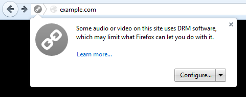 >Поддержка API Encrypted Media Extensions, развиваемого организацией W3C и реализующего элементы поддержки DRM (Digital Rights Management) для организации защиты от копирования видеоконтента, встраиваемого в web-страницы через HTML5-теги video и audio. Декодирование DRM-контента осуществляется через отдельно устанавливаемый проприетарный модуль Adobe Primetime CDM (Content Decryption Module), который загружается автоматически при возникновении необходимости в отображении зашифрованного контента. CDM-модуль запускается в отдельном sandbox-контейнере, изолированном от остальной части браузера. При желании CDM-модуль можно отключить или удалить: в интерфейсе управления плагинами можно отключить плагин Adobe Primetime DRM или в настройках "Content" снять метку с пункта "Play DRM content". В случае применения модуля пользователю выводится уведомление.