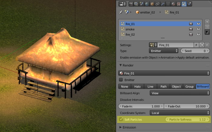 - Поддержка мягких частиц, т.е частиц плоскости которых плавно растворяются при соприкосновении с окружающими поверхностями. Чтобы настроить эффект, достаточно активировать соответствующую опцию в настройках системы частиц Blender. Также добавлена возможность регулировать степень проявляемости данного эффекта.