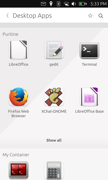 >Ключевым улучшением в новой версии является поддержка установки обычных настольных приложений, поставляемых в виде deb-пакетов в репозиториях Ubuntu и Debian, в том числе программ, использующих X11 (ранее в десктоп-режиме поддерживался только запуск мобильных приложений). Запуск X-приложений в окружении Mir и Unity 8 организован при помощи XMir c применением отдельного изолированного контейнера. Контейнер построен при помощи пакета Libertine, позволяющего создавать изолированные окружения, предназначенные для установки и выполнения программ из deb-пакетов.