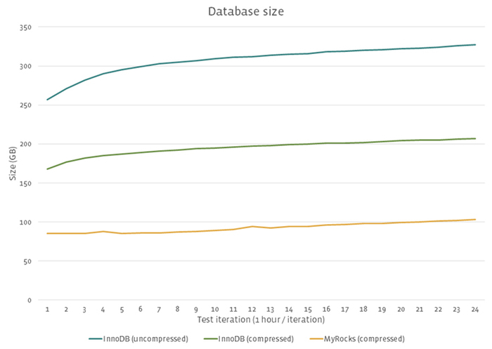 В качестве основных причин большого потребления дискового пространства в InnoDB отмечается фрагментация, низкая степень сжатия и выравнивание сжатых данных внутри хранилища по страницам фиксированного размера (размер страницы 8 Кб и даже если данные упакованы в 5 Кб всё равно будет израсходован блок в 8 Кб). Хранилище MyRocks лишено данных недостатков, так как применяет размер страницы плавающего размера и предоставляет значительно более эффективный метод сжатия. MyRocks также выполняет меньше операций последовательного чтения/записи за счёт использования модели хранения данных в форме лога (Log Structured Merge Trees), допускающей только дополнение (чистка производится сборщиком мусора).
