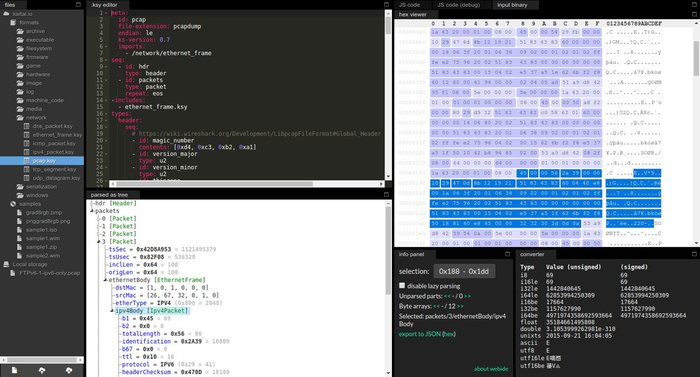 Выдает полуфабрикат ksy, который можно доработать руками, попереименовать поля, дорасставить типы и т.д.