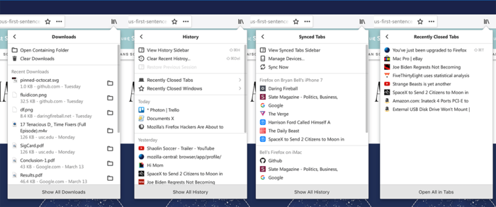 >новая кнопка "Библиотека", предоставляющая доступ к истории посещений, закладкам, загрузкам, синхронизированному контенту и ссылкам в Pocket
