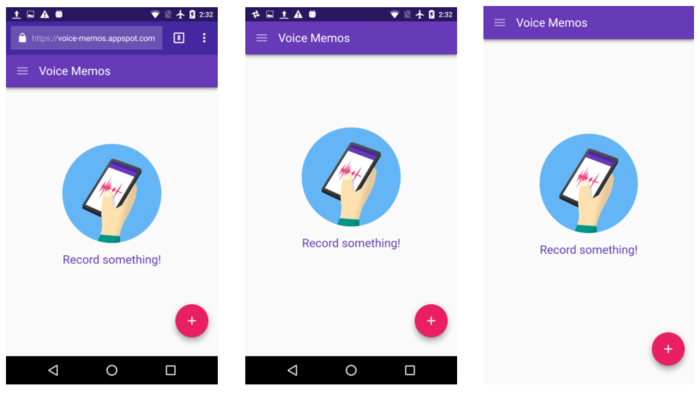 Указав в файле-манифесте приложения свойство "display: fullscreen" web-приложение будет открываться без служебных кнопок, панели и адресной строки, если программа запущена через ярлык на домашнем экране