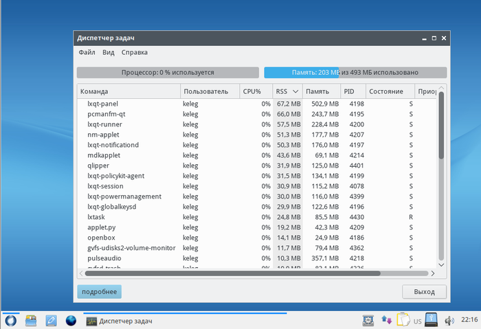 Память 203МБ из... смотрим на процессы, lxqt-panel память 502.9МБ!!!! Клоуны, даже перевод не могут проконтролировать.