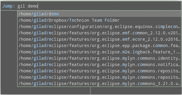 Ключевой особенностью JumpFm является возможность быстро "перепрыгивать" между разными каталогами без использования закладок - при нажатии клавиши "j" и вводе произвольного набора ключей, файловый менеджер автоматически предлагает наиболее релевантные запросу пользователя варианты перехода.