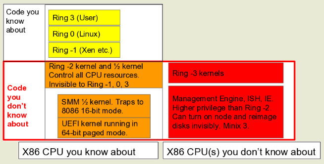 > параллельно с основной операционной системой параллельно выполняется ещё несколько неконтролируемых программных окружений (UEFI, SMM, Intel ME), которые формируются на основе проприетарных прошивок. Код UEFI продолжает работать после загрузки основной ОС и выполняется на уровне кольца защиты Ring -2.