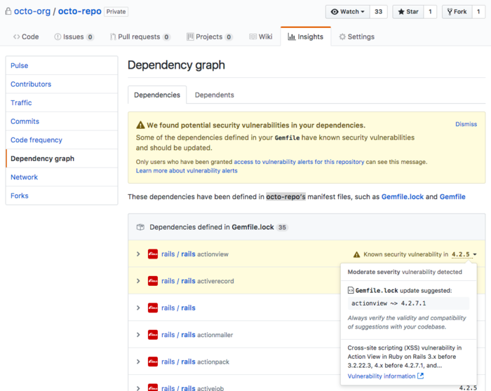 GitHub реализовал отображение меток, информирующих об использовании проектами зависимостей с неисправленными уязвимостями. Вместе с меткой также выводятся сведения о путях устранения проблемы и версиях, в которых уязвимость уже устранена. В настоящее время выставление меток добавлено только для проектов на языках Javascript и Ruby, которые составляют 75% от кода с зависимостями, размещённого на GitHub. В 2018 году ожидается вывод аналогичных меток для проектов на языке Python. Вывод уведомлений об уязвимостях и построение графа зависимостей по умолчанию включено для всех публично доступных проектов.
