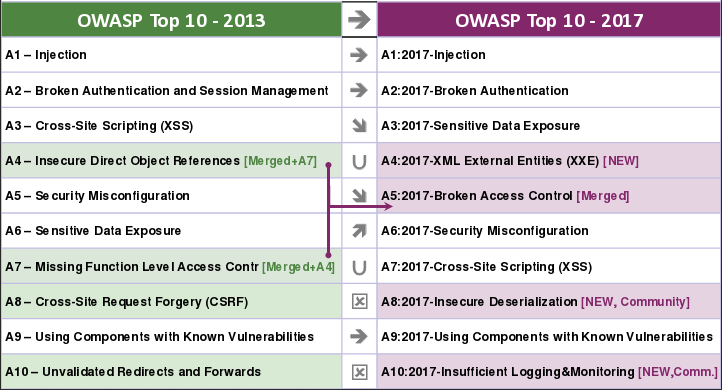 Как и в прошлом выпуске рейтинга, который был сформирован в 2013 году, первое место занимают уязвимости, при которых непроверенные данные оказываются в составе исполняемых команд или запросов (SQL, NoSQL, OS, LDAP Injection). Второе место как и прежде занимают уязвимости, связанные с некорректной работой механизмов аутентификации и проверки идентификаторов сеансов, что позволяет получить неавторизированный доступ. Занимавшие третье место в прошлом рейтинге проблемы межсайтового скриптинга (XSS) переместились на 7 место.